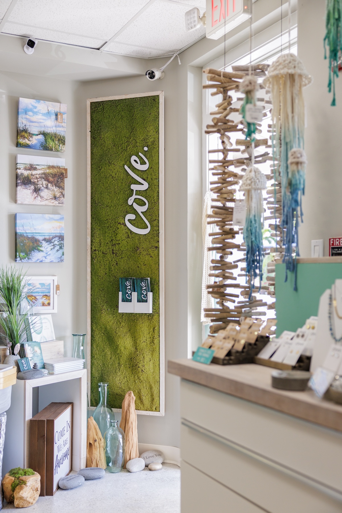 COVE is a haven for not only coastal themed gifts but also a place to showcase local artists and their ocean-inspired work. Even the floor is in a beach state of mind – it’s a hand painted waterscape rendering from the sand to the deep ocean. Walk away smiling with any number of treasures, from original paintings and reclaimed wood art to jewelry, clothing, glasswork and gifts for the young and young at heart.