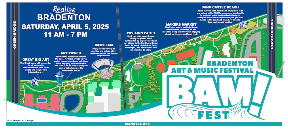 BAM!Fest (Bradenton Art & Music Festival) is a free event that will transform the Riverwalk into a dynamic, diverse, immersive art and music experience from bridge to bridge!