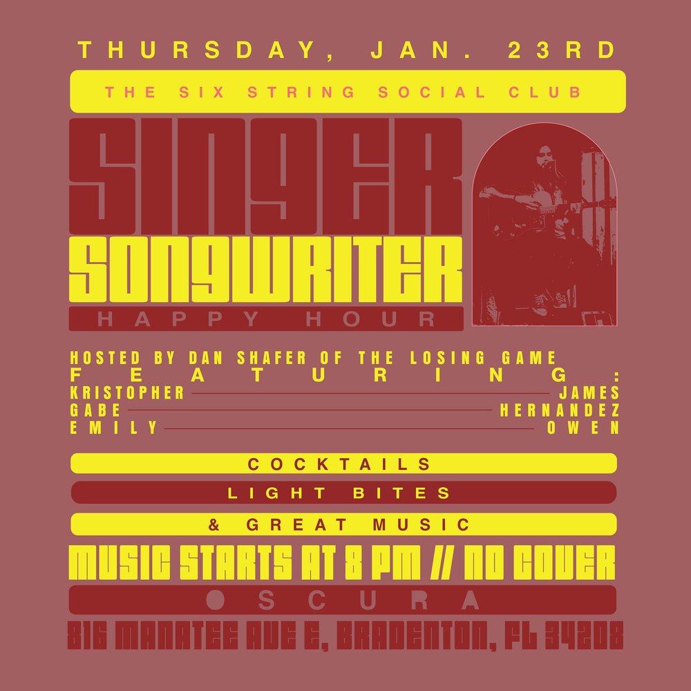 “Six String Social Club” – Singer / Songwriter Happy Hour Hosted by Dan Shafer of The Losing Game ft. Kristopher James Gabe Hernandez Emily Owen