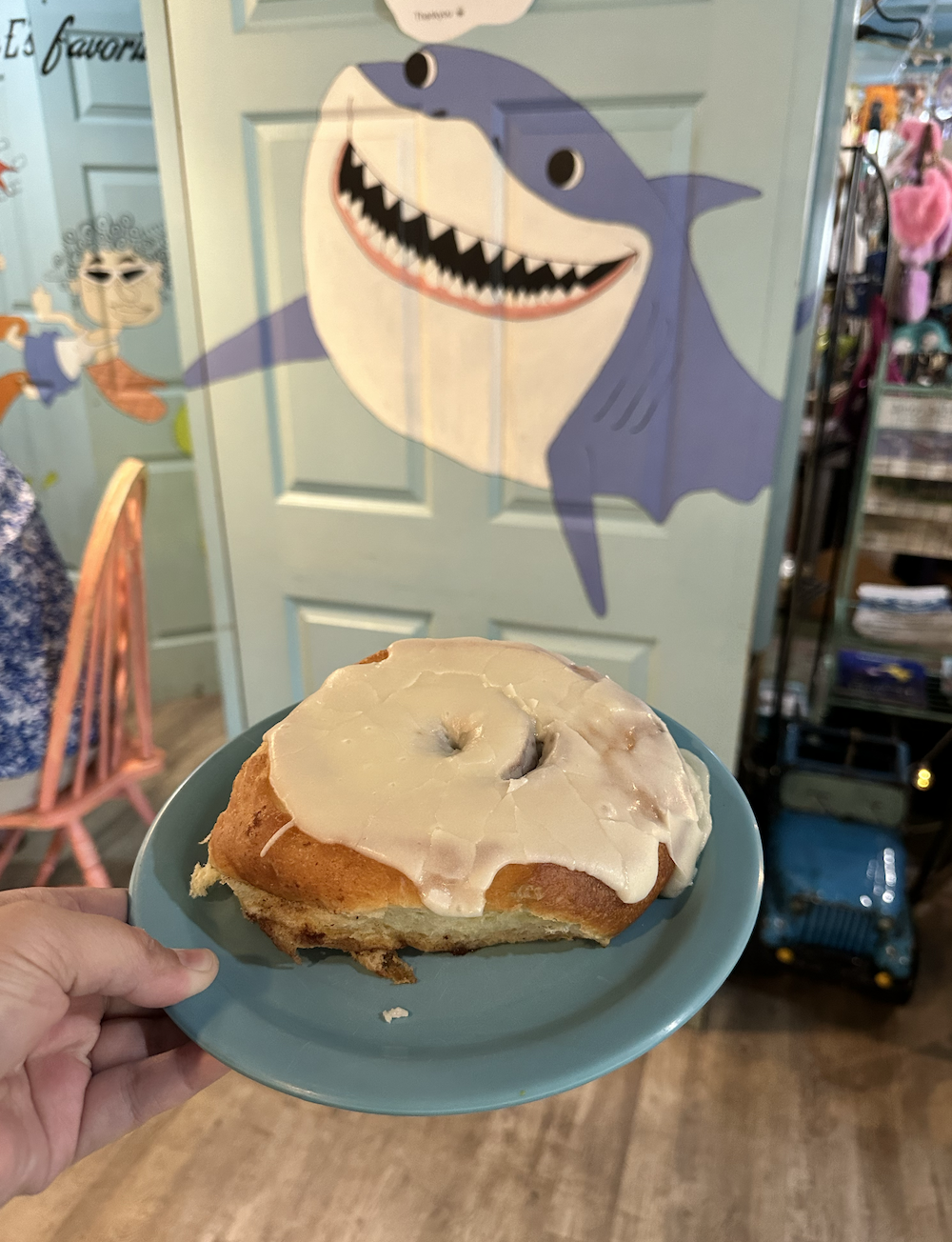Now that you know some of the history that makes this place so iconic, let’s get back to all those treats and treasures mentioned earlier! You can’t go to Ginny and Jane E’s without ordering a cinnamon roll – and you better believe the Fosters didn’t mess with Jane’s beloved recipe, featuring a decadent crème brûlée icing. (Fun fact: One of Jane’s original bakers still works at the cafe.) Other Jane creations remain on the menu too, as well as house-made sandwiches, quiches, and salads that the Fosters introduced since adding a full kitchen.
