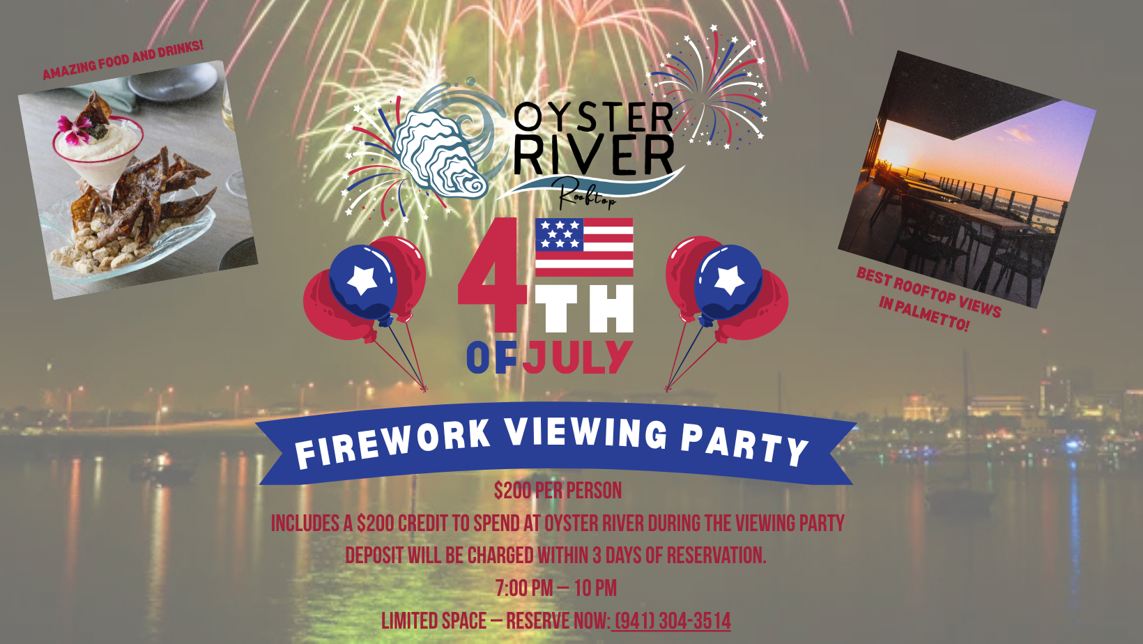 $200 per person entry, which includes a $200 food & drink credit Unmatched rooftop views of the Palmetto fireworks Curated menu of elevated holiday bites and signature cocktails This event offers limited space (only 30 people) and is expected to sell out. Reservations must be made by calling 941-304-3514 or RSVPing in eventbrite so we can contact you.