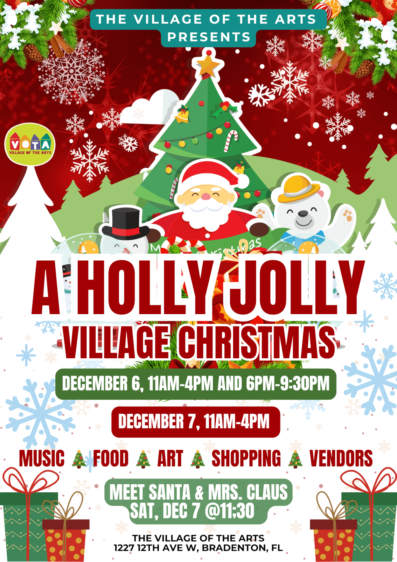 It’s A Very Merry Artsy Christmas at Bradenton’s One & Only Village of the Arts, Dec. ArtWalk,  Fri. Dec. 1st.  6-9:30pm. &  Sat.  Dec. 2nd. 11am-4pm. Holiday Music, Christmas Treats and Lots and Lots of Fine Arts & Crafts.  And Santa too of course!!  The place to be for the…