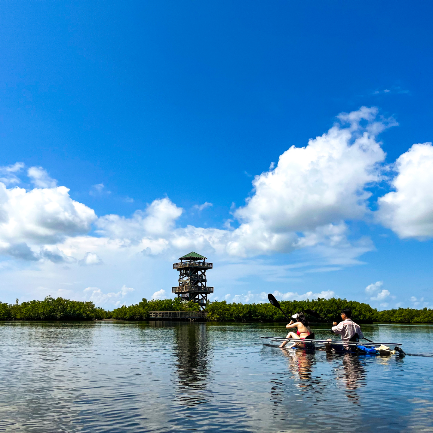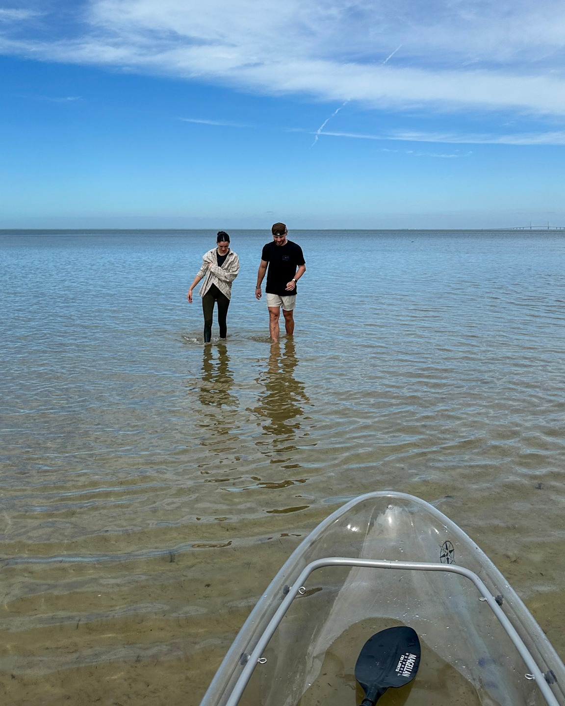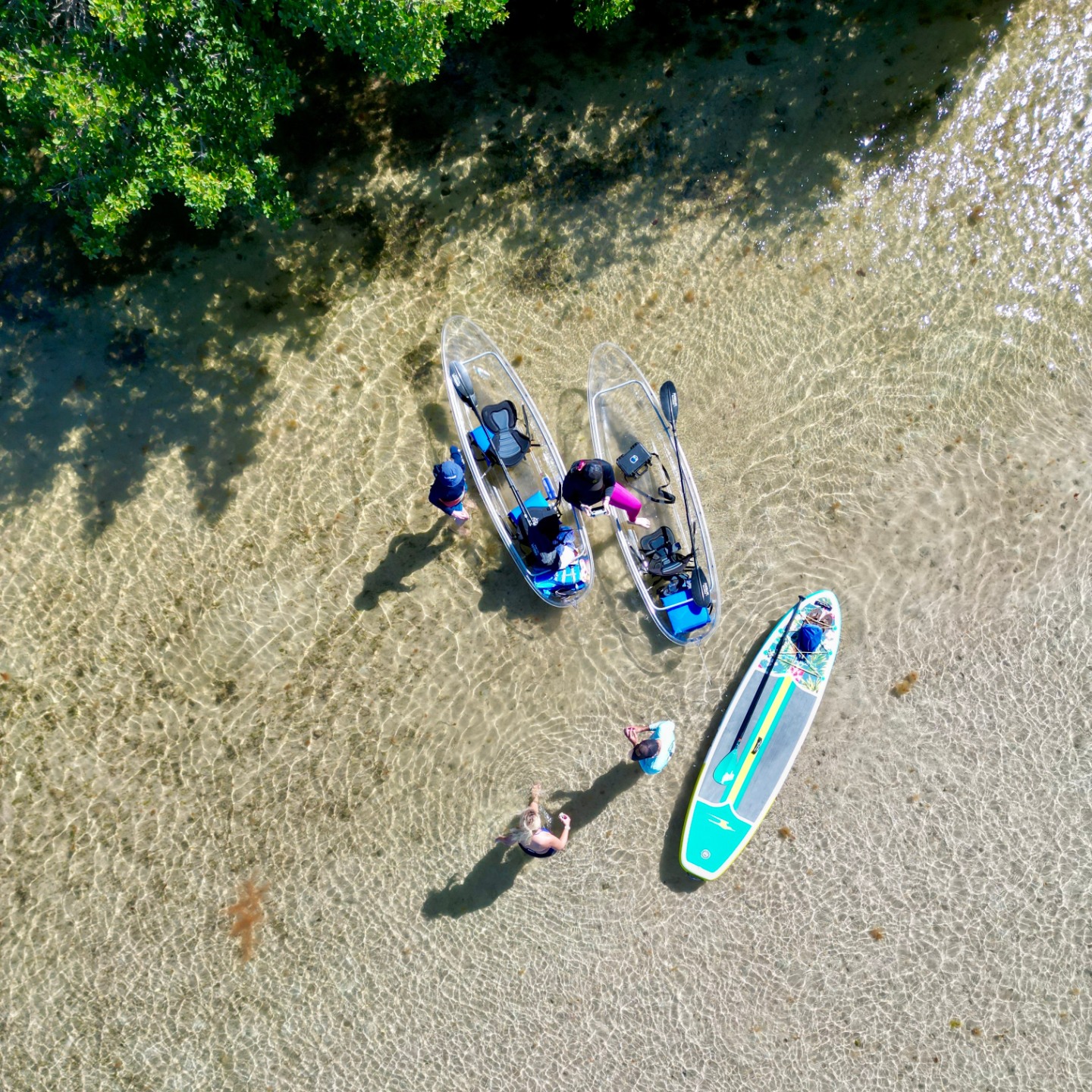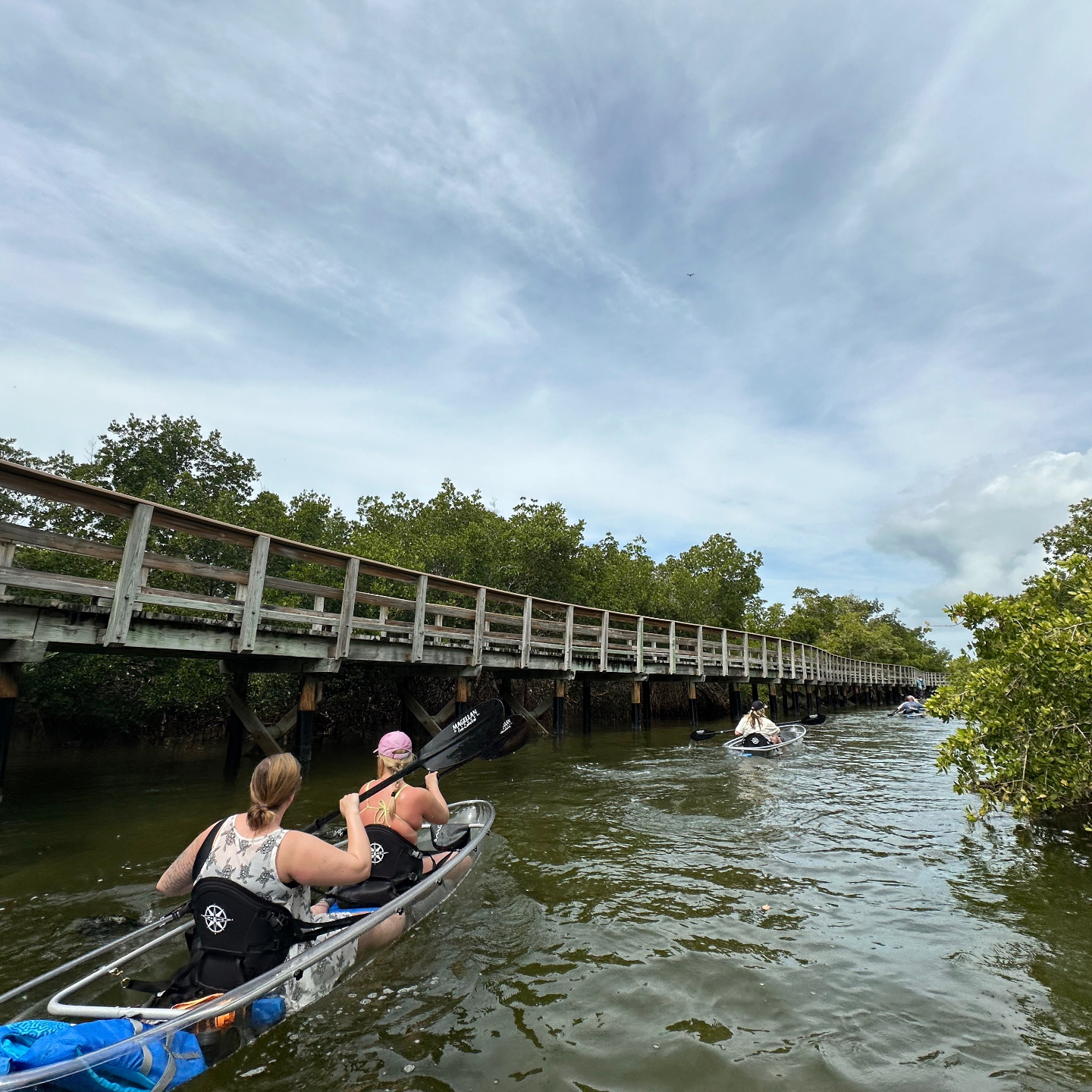 The crystal clear kayaks provide a view like no other to what swims below as we paddle through the mangrove forest on the way to Tampa Bay to take a dip! Along the way, guests may spot wildlife such as fish, turtles, various bird species, spotted eagle rays + even the occasional dolphin + manatee! We love sharing the water with wildlife but cannot guarantee sightings.